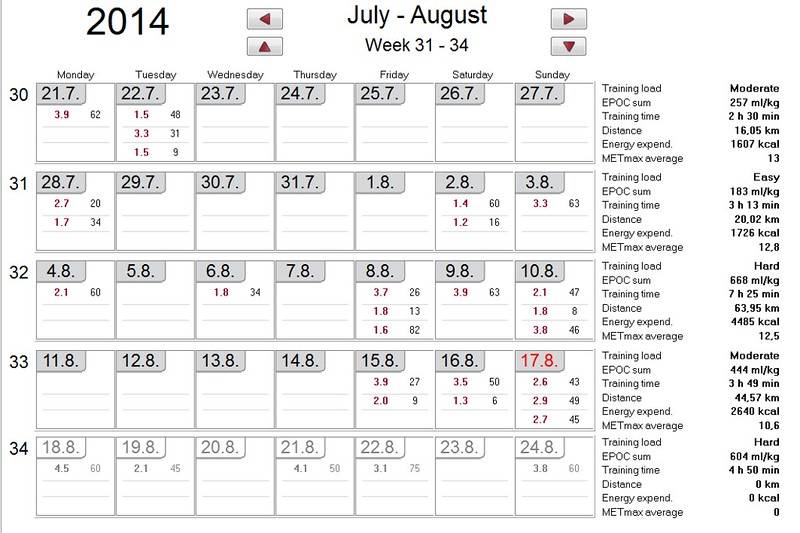 Viikon siis piti olla kevyt, mutta mittareiden ja kropan mielestä tuntui raskaammalta kuin aluksi odotti. Allaoleva harjoitushistoria-logi on muuten otettu varsin mainosta FirstBeat Athlete ohjelmasta, johon olen ottanut talteen Movescountista kaikki Ambitilla tehdyt harjoitukset sekä kaikki aikaisemmat Suunnon T6:lla tehdyt harjoitukset.