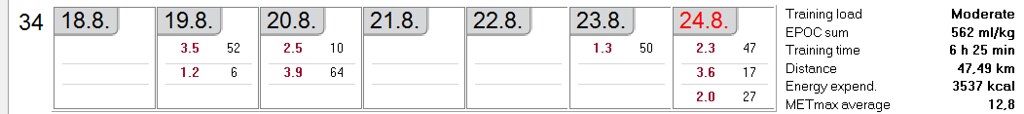 Viikko 34 oli monella tapaa jännä viikko treenauksen kannalta. Tiistaina kävin lenkillä ja kroppa tuntui olevan niin poikki, ettei lenkistä tuntunut tulevan mitään muuta kuin paha mieli. Keskiviikkona oli mäkitreenit, jotka menivät mukavasti - vaikka kroppa tuntuikin väsyneeltä.